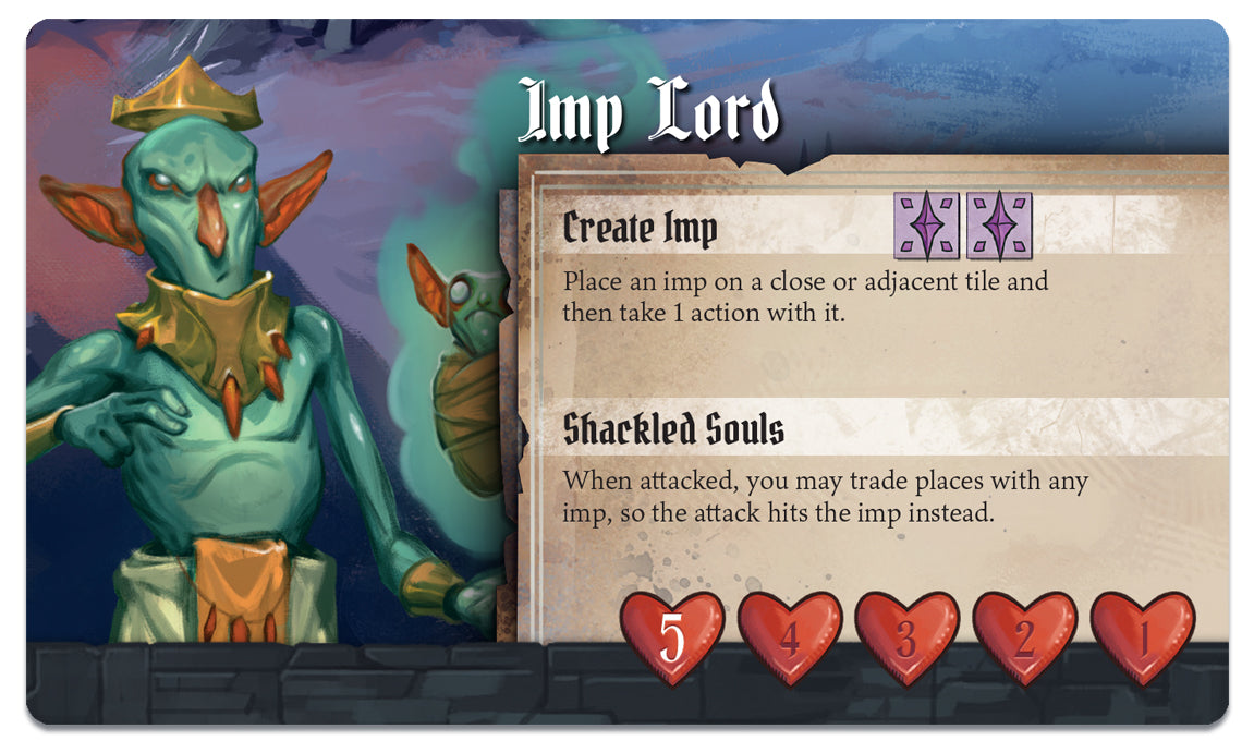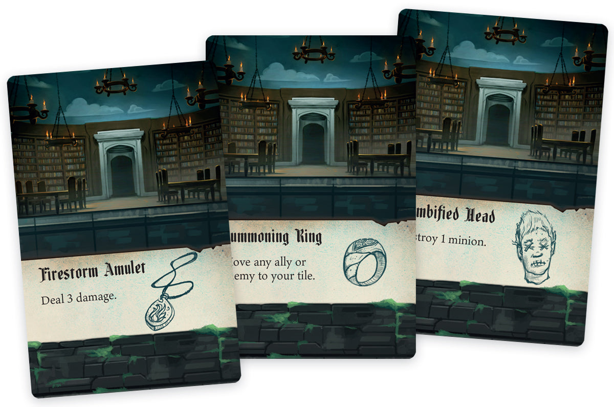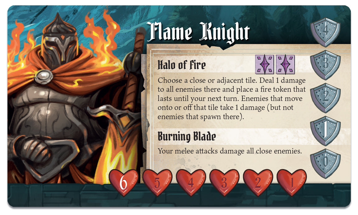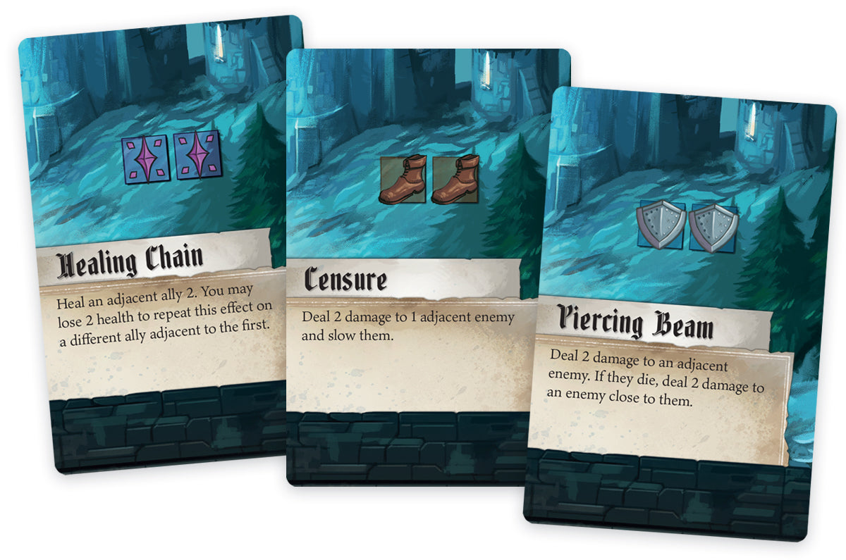 During the game, you choose a unique knight or demon, each with a variety of special powers—such as the Flame Knight’s ability to surround his foes in fire, or the Bone Crusher’s power to summon skeletal minions. The cards you play from your hand to perform actions can each be used in different ways, and a set of unique location tiles allows you to create the monastery with a different layout every game.