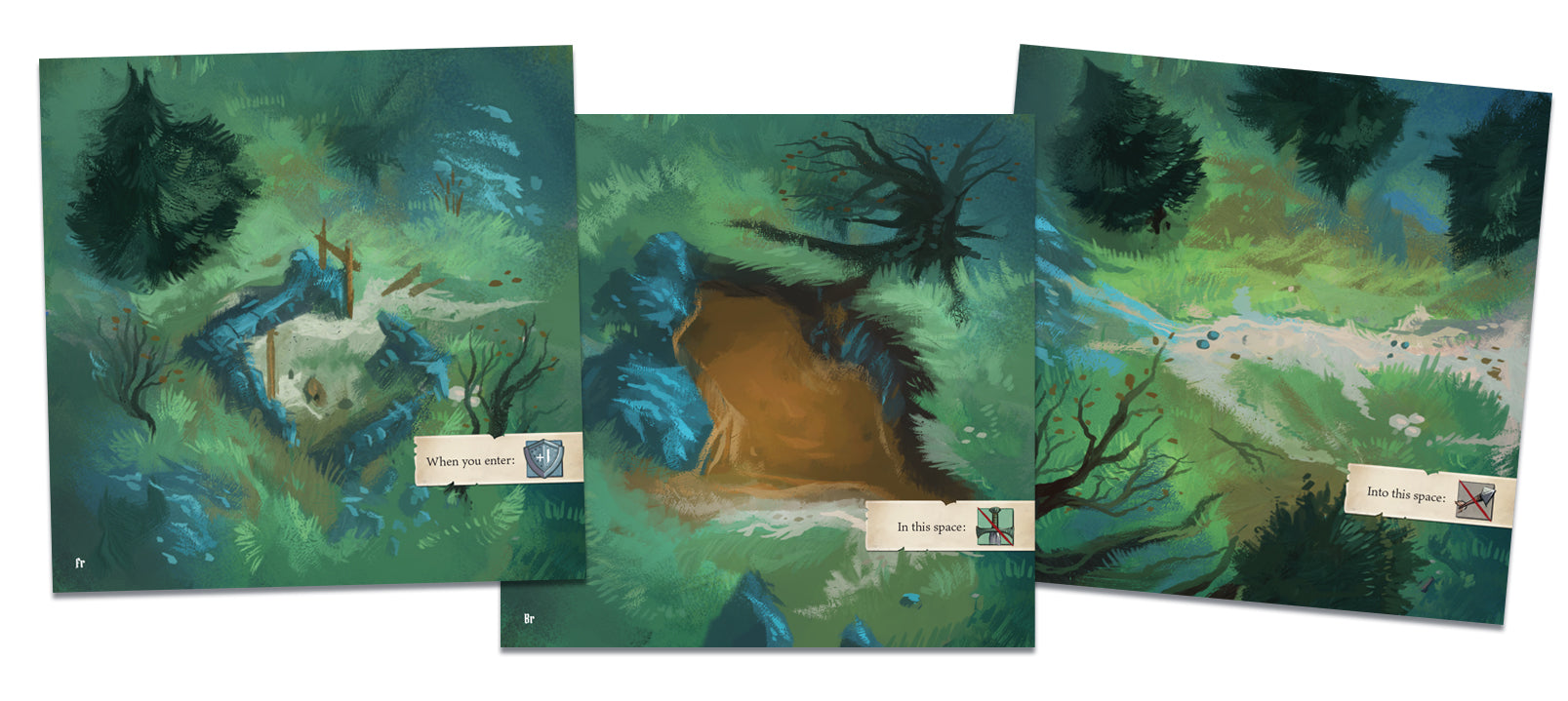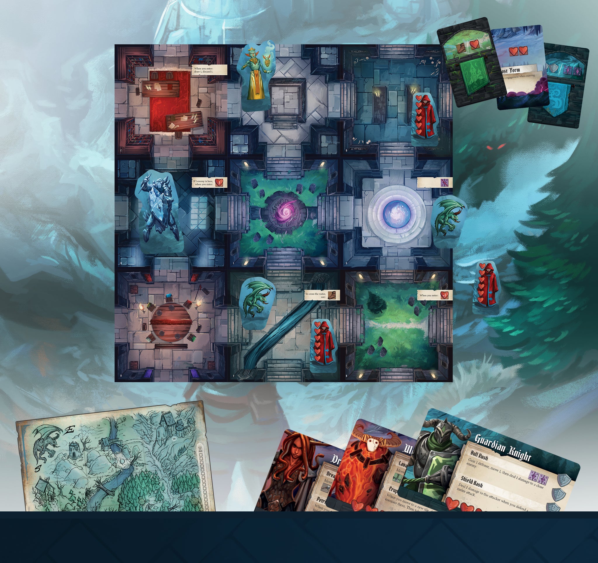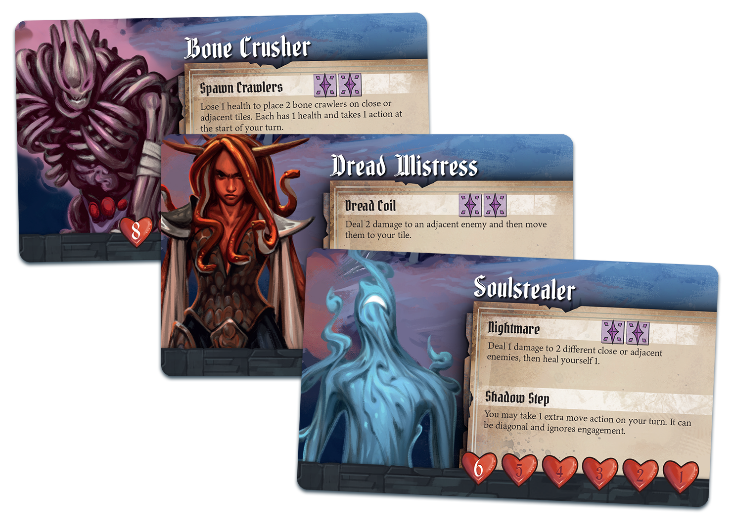 During the game, you choose a unique knight or demon, each with a variety of special powers—such as the Flame Knight’s ability to surround his foes in fire, or the Bone Crusher’s power to summon skeletal minions. The cards you play from your hand to perform actions can each be used in different ways, and a set of unique location tiles allows you to create the monastery with a different layout every game.